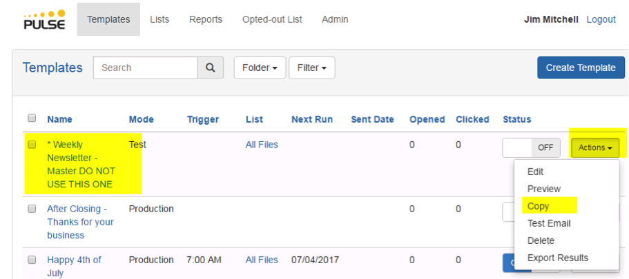 9. Under Step 2 change the Name of the Template by removing Master DO NOT USE THIS ONE_#### and replacing it with today’s date. So it would look like this *Weekly Newsletter – 06-15-17 and click