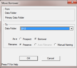 • Click the down arrow under the Data Folder box on the Move Borrower screen and select 2012 folder and click on OK and YES move the loan